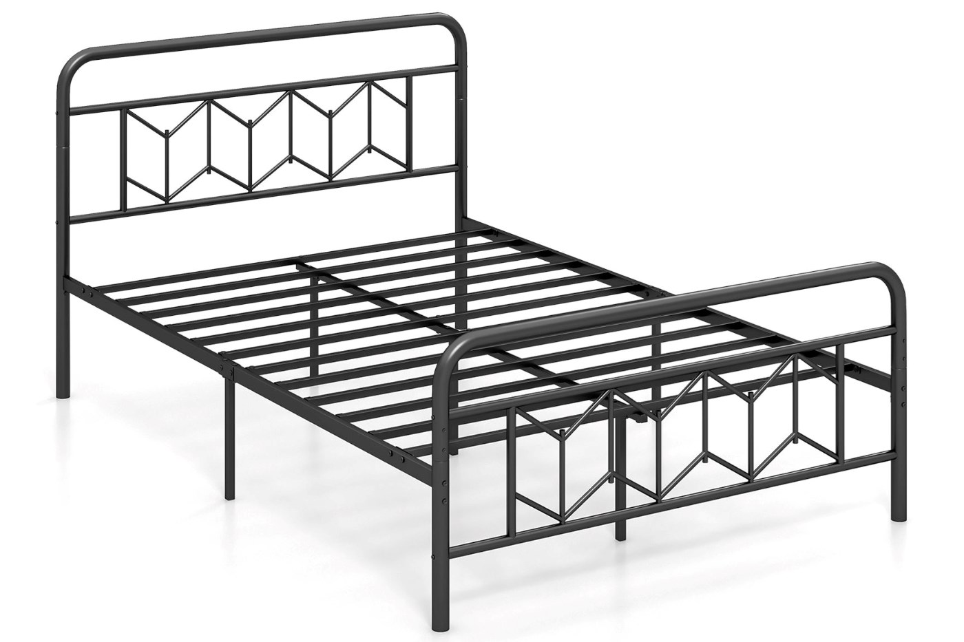 The Crosby Metal Bed Frame features a tall headboard adorned with an intricate graphic pattern. Its matching footboard completes the balanced and stylish design, while the pattern creates a clever 3D illusion, bringing a modern and striking element to any bedroom.
